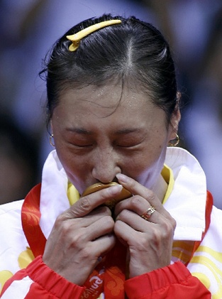 33歲的張寧深吻著來之不易的金牌
