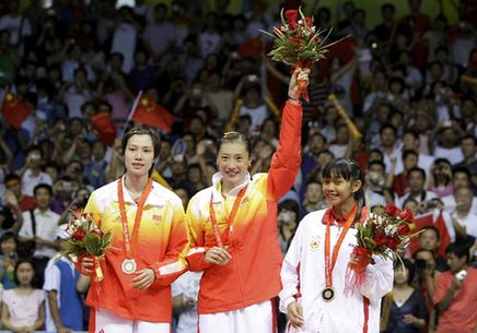 羽毛球女單冠亞季軍得主:冠軍中國選手張寧(中)、亞軍中國選手謝杏芳(左)、季軍印尼選手尤莉安蒂(右)