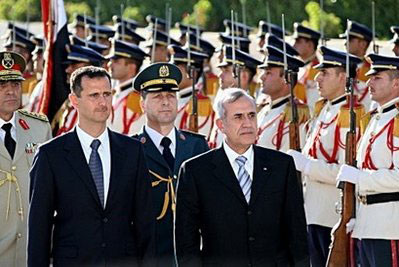 在大馬士革,蘇萊曼(右)與巴沙爾檢閱儀仗隊(duì)。[法國(guó)媒體圖片]