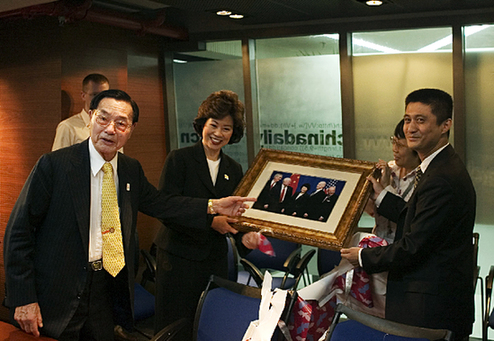 2008年8月25日,美國勞工部長趙小蘭(左二)接受中國日?qǐng)?bào)網(wǎng)專訪。圖為《中國日?qǐng)?bào)》副總編輯黃慶(右二)向趙小蘭贈(zèng)送禮物。