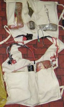 據(jù)警方介紹,馬甲上裝了近15公斤的炸藥。炸藥被分成了6個(gè)部分,有2處是類(lèi)似雷管的裝置,另外4個(gè)則是包裹緊密的炸藥。