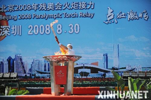 8月30日,最后一棒火炬手沈建平點燃圣火盆后展示火炬。當日,北京殘奧會圣火在深圳進行傳遞。 新華社記者楊光攝