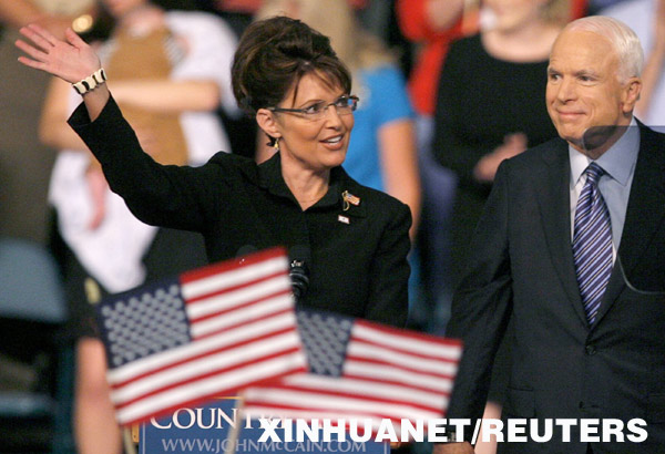 8月29日,在美國俄亥俄州代頓市,美共和黨總統(tǒng)競選人麥凱恩(右)在競選集會上介紹他的競選伙伴、44歲的阿拉斯加州女州長莎拉·佩林(左)。