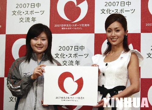 4月5日,“2007日中文化體育交流年”親善大使酒井法子(右)和福原愛手持“2007日中文化體育交流年”標志在日本東京正式亮相。當日,日本“2007日中文化體育交流年”實行委員會召開新聞發(fā)布會宣布,日本著名演員、歌手酒井法子和乒乓球運動員福原愛將分別出任本次活動的文化親善大使和體育親善大使。親善大使將參加2007年日中文化體育交流年所舉行的主要活動。新華社記者任正來攝