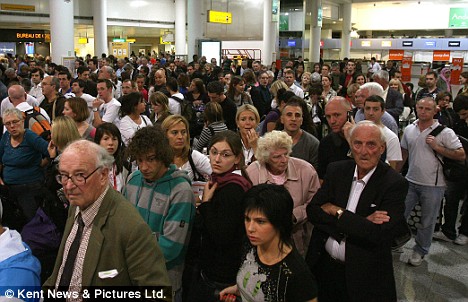 乘客們?cè)诒R頓機(jī)場(chǎng)等待消息