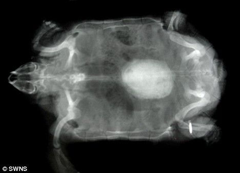 獸醫(yī)組負(fù)責(zé)人莎倫·雷德羅塞介紹說,獸醫(yī)日前為園內(nèi)的動物做了例行體檢,當(dāng)用X光照一只名叫波莉的雌性非洲餅干龜時,醫(yī)生們驚奇地發(fā)現(xiàn)它體內(nèi)竟然有一個雞蛋大小的東西,而5歲大的波莉身長才不過5.5英寸(約合14厘米)!