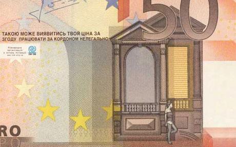 據(jù)英國《每日電訊報》10月8日報道,這套樣鈔分別面值5歐元、10歐元和50歐元,雖然屬于正常渠道發(fā)行,但是不能流通。樣鈔背面的圖案上除了多了一名穿著暴露、搔首弄姿的妓女外,左上方的位置還寫有相關的警示語,告誡那些試圖通過非法途徑來歐盟國家務工的人所付出的真正代價。由于添加的妓女圖案較小、顏色也不顯眼,這套樣鈔幾乎很難與真鈔分辨開來。