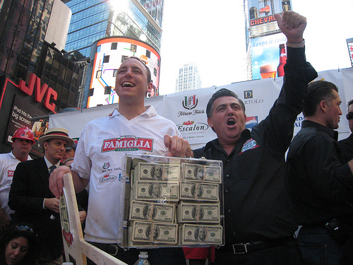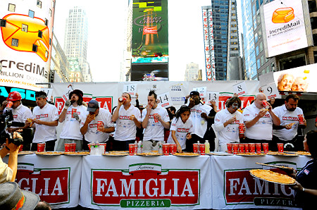 中國日報(bào)網(wǎng)環(huán)球在線消息:在10月12日紐約時(shí)代廣場上舉行的首屆“Famous Famiglia杯”國際吃匹薩餅大賽中,曾連續(xù)兩年獲得“內(nèi)森杯”國際吃熱狗大賽冠軍的美國“大胃王”喬伊·切斯特納特不負(fù)眾望,在10分鐘內(nèi)吃下45塊匹薩餅一舉奪冠。