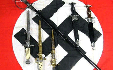 據(jù)英國(guó)北安普頓郡亨伯特拍賣商的常務(wù)董事亨伯特介紹,他們?cè)谧罱囊淮闻馁u會(huì)上買入了“一大批納粹物資”,這些物資是在清理德國(guó)一間簡(jiǎn)易住房時(shí)發(fā)現(xiàn)的,總成交價(jià)為2600英鎊(合4554美元)。“這些物資中包括一面5英尺(1.5米)乘10英尺(3米)大小的軍旗,5、6把傳說中的納粹戰(zhàn)劍。特別幸運(yùn)的是,其中還有一枚骷髏頭戒指,上面刻著納粹頭目希姆萊的名字和‘長(zhǎng)刀之夜’的日期,”他說?!伴L(zhǎng)刀之夜”是指1934年6月30日,那天希特勒在柏林和慕尼黑對(duì)納粹沖鋒隊(duì)頭目恩斯特·羅姆等人進(jìn)行了清除行動(dòng)。