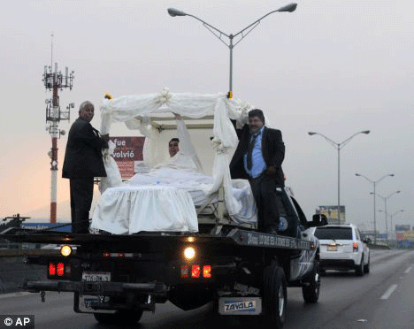 由于依然無(wú)法下地行走,烏里韋不得不依靠一輛貨運(yùn)卡車連人帶床將他運(yùn)到了婚禮儀式現(xiàn)場(chǎng)。只見(jiàn)那張為他量身定做的床搭起了一個(gè)帳篷,并用鮮花和鑲著金邊的蝴蝶結(jié)裝飾一新。路上,兩輛交警巡邏車專門為烏里韋開(kāi)道,避開(kāi)擁堵的交通。