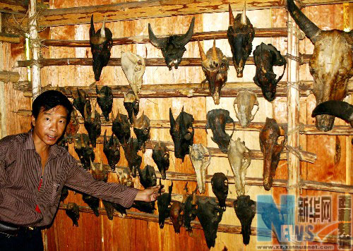 這是僜人青年在村展覽室里介紹過去打獵的戰(zhàn)利品(9月17日攝)。