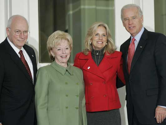 左:副總統(tǒng)切尼及夫人林恩;右:新當(dāng)選副總統(tǒng)拜登及夫人吉爾