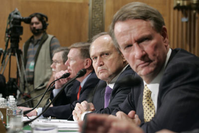 美國汽車業(yè)“三巨頭”通用、克萊斯勒和福特的首席執(zhí)行官(由右至左)出席國會聽證會。