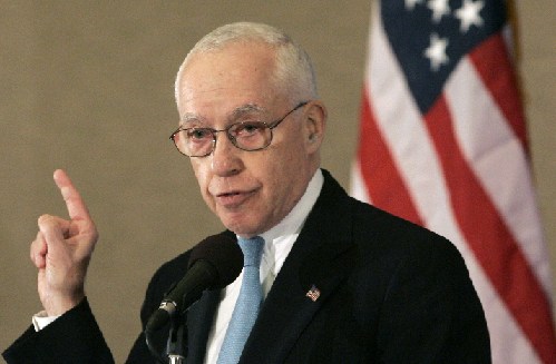 美國(guó)司法部長(zhǎng)邁克爾·穆凱西3月在舊金山演講時(shí)的照片