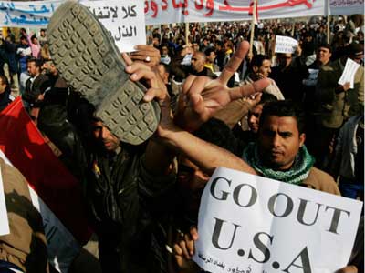 巴格達(dá)薩德?tīng)柍敲癖娭С置伤蔂枿C扎伊迪向布什的“扔鞋”行為,反對(duì)美國(guó)駐軍。