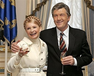 2008年2月,烏克蘭總理季莫申科(左)和總統(tǒng)尤先科為他的生日舉杯慶祝。(法國(guó)媒體圖片)