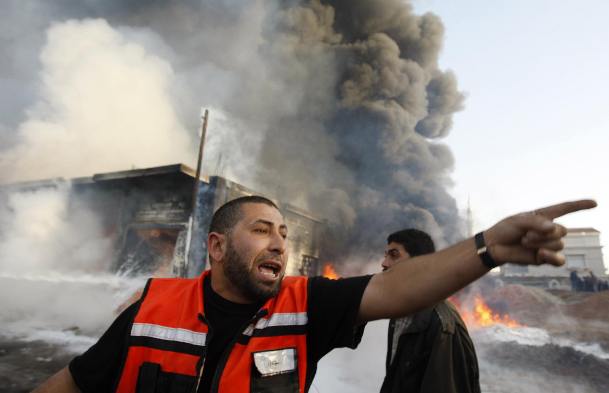 圖為:一名巴勒斯坦消防員在被以色列轟炸的大樓前