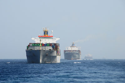 在“武漢”號(hào)導(dǎo)彈驅(qū)逐艦的帶領(lǐng)下,被護(hù)航的中國(guó)商船一字排開航行。