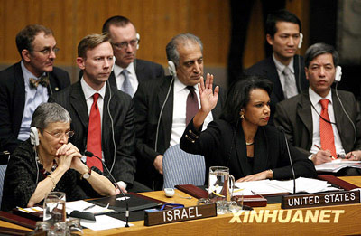 1月8日,在美國(guó)紐約聯(lián)合國(guó)總部,美國(guó)國(guó)務(wù)卿賴斯(前右)在安理會(huì)表決時(shí)舉手投棄權(quán)票。前左為以色列常駐聯(lián)合國(guó)代表沙萊夫。