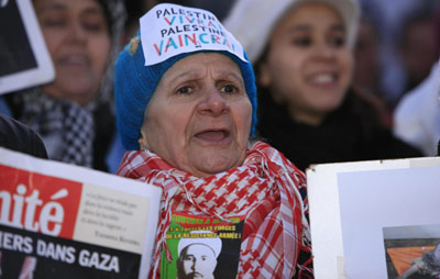 1月10日,一名支持巴勒斯坦的婦女在法國巴黎舉行的反戰(zhàn)游行上高呼口號。