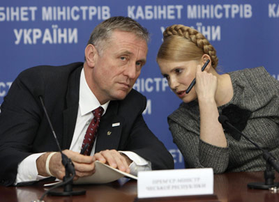 1月11日,烏克蘭總理季莫申科(右)與歐盟輪值主席國捷克總理托波拉內(nèi)克在基輔出席記者招待會。季莫申科宣布,烏方已在成立過境輸氣監(jiān)督委員會的議定書上簽字。