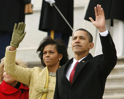 ![]() 奧巴馬總統(tǒng)和夫人向人群揮手示意