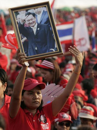 一名“反獨(dú)聯(lián)”示威者高舉前總理他信的頭像
