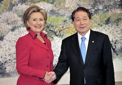 希拉里與韓國(guó)外交通商部長(zhǎng)官柳明桓會(huì)面