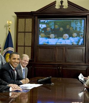 當(dāng)天陪同奧巴馬進(jìn)行這次連線活動的有幾名國會議員和華盛頓的一群小學(xué)生。小學(xué)生們見到總統(tǒng)后又看到宇航員出現(xiàn)在電視畫面上,個個興奮不已,拋出了很多問題,比如“宇航員吃什么”、“能不能在太空中玩電子游戲”、“學(xué)什么才能成為宇航員”、“有沒有發(fā)現(xiàn)新的生命形式”等等。當(dāng)一個學(xué)生問“宇宙里到底有多少星星”時,在場所有人都被逗樂了,“我也很想知道這個問題的答案,”奧巴馬開心地說。這個問題還真把宇航員難住了,他們想了會兒才承認(rèn),“空間站外面有很多美麗的星星,不過把它們一個個數(shù)下來有點(diǎn)困難”。