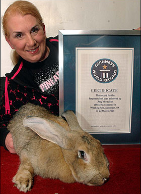 這只名叫艾米的巨型兔長(zhǎng)1.2米,體重20公斤,每天要吃掉兩個(gè)蘋(píng)果、半個(gè)卷心菜、一把胡蘿卜,以及大量新鮮青草和混合飼料,2008年它被吉尼斯世界紀(jì)錄評(píng)為全球體積最大的兔子。據(jù)艾米的主人、現(xiàn)年56歲的英國(guó)婦女安妮特·愛(ài)德華茲介紹,她前不久帶著艾米從英國(guó)飛往意大利參加一檔紀(jì)錄片節(jié)目的拍攝。但在拍攝完成當(dāng)晚,艾米就在旅館里告別了人世。
