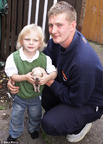 勇救小狗的水管工威爾·克雷格和抱著小狗的丹尼爾。