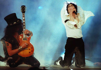 原槍炮玫瑰樂(lè)隊(duì)吉他手斯拉什和杰克遜同臺(tái)演出時(shí)用的就是保羅發(fā)明的電吉他