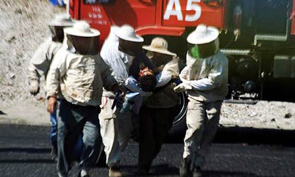 ![]() 養(yǎng)蜂人在救助傷者(報道此事的電視畫面截圖) 中國日報網(wǎng)環(huán)球在線消息:綜合英美媒體報道,9月28日,土耳其南部高速公路上發(fā)生了一起轉(zhuǎn)運蜜蜂的廂式貨車與大卡車相撞事故。由于運蜂車的車廂被毀,成千上萬只蜜蜂逃出來后逢人便蜇,場面甚為恐怖。事故共造成一人死亡數(shù)十人受傷,這也再次提醒人們:馬蜂窩的確捅不得。 事故發(fā)生后,原本在廂式貨車內(nèi)負(fù)責(zé)照看蜂箱的兩個人被困在了里面無法出來。聞訊趕來的車輛救援人員、警察、醫(yī)護(hù)人員和養(yǎng)蜂人一起,共用了一個多小時才最終將兩人抬出。此時,兩人全身早已趴滿了蜜蜂,被蜇得體無完膚。送院后,由于其中一位18歲的年輕人傷勢過重,再加上蜂毒的綜合作用,不治身亡。 另有20多位前往救援的人也被蜇傷并需要治療,其中3位傷勢較重,需要特別護(hù)理。 “成千上萬只蜜蜂從車廂里逃了出來,它們一旦發(fā)現(xiàn)移動著的目標(biāo)便群起而攻之。我自己也被蜇了好幾次,”當(dāng)?shù)匾患彝ㄓ嵣绲挠浾邉P南?居爾比茲說。居爾比茲是最早前往事發(fā)地點進(jìn)行報道的媒體工作者之一。 “當(dāng)我到達(dá)那里的時候,有一個人正躺在地上。為了擺脫叮在他身上的蜜蜂,他把衣服都脫掉了,但是蜜蜂很快又布滿了他的身體,就連救援人員都無從下手。他被抬到救護(hù)車上以后,蜜蜂又追蹤到了車?yán)?,還把一位護(hù)士也蜇傷了,”居爾比茲說。 救護(hù)車抵達(dá)醫(yī)院后,醫(yī)生們不得不首先對車輛和人員進(jìn)行消毒,然后才能開始動手實施救治。蜂群也緊跟著救護(hù)車來到了醫(yī)院,醫(yī)生們一邊用布塊驅(qū)趕著蜜蜂一邊對傷者進(jìn)行治療。 養(yǎng)蜂人穆拉特?喬班說:“有朋友打電話告訴我們出了事故,并要求派人幫忙,我們找到了10個養(yǎng)蜂人乘車前往,那里總共有500至600箱蜜蜂。”他們趕到事發(fā)地點后,先用水柱驅(qū)趕蜜蜂,后來又在旁邊生起了煙火,試圖熏走蜜蜂。歷時4個多小時后,蜂群終于被徹底驅(qū)散。 其間,當(dāng)?shù)亟煌ň觳坏貌辉谑掳l(fā)路段用擴音喇叭提醒過往司機關(guān)閉車窗,以防蜜蜂鉆進(jìn)車內(nèi)蜇人。盡管如此,仍有不少行人未能幸免,有的被蜇傷后干脆改變了行車路線,直奔醫(yī)院接受治療。 養(yǎng)殖蜜蜂是土耳其南部地區(qū)的一項重要產(chǎn)業(yè)。發(fā)生撞車事故的運蜂車本來是在返回家鄉(xiāng)的路上,此前這位養(yǎng)蜂人就在附近森林里放養(yǎng)蜜蜂。 (環(huán)球在線:柳洪杰)