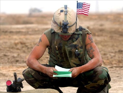 從2007年開始,美軍開始大量增兵伊拉克。在這幅圖中,一名美軍士兵正在閱讀母親的信件。為了支持兒子參加的戰(zhàn)爭,這位英雄母親還隨信寄來一面國旗。