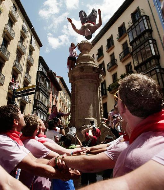 一名男子從西班牙潘普洛納市的納瓦拉噴泉翻身跳下。