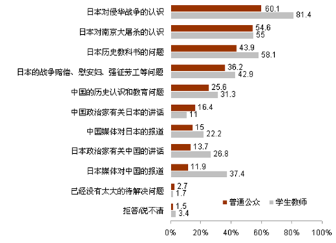 “日本對(duì)侵華戰(zhàn)爭(zhēng)的認(rèn)識(shí)”問題亟待解決是國(guó)人心目中不爭(zhēng)的事實(shí)。另外,“日本歷史教科書的問題”和“日本對(duì)南京大屠殺的認(rèn)識(shí)”也是中國(guó)民眾心中對(duì)中日間歷史問題的痛處所在?!叭毡久襟w對(duì)中國(guó)的報(bào)道”在學(xué)生教師中也備受關(guān)注(37.4%)。