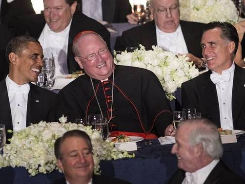 10月18日,美國(guó)總統(tǒng)奧巴馬(左)、主教蒂莫西?多蘭(中),共和黨總統(tǒng)候選人羅姆尼(右)在紐約沃爾多夫?阿斯托利亞酒店參加阿爾?史密斯晚宴。