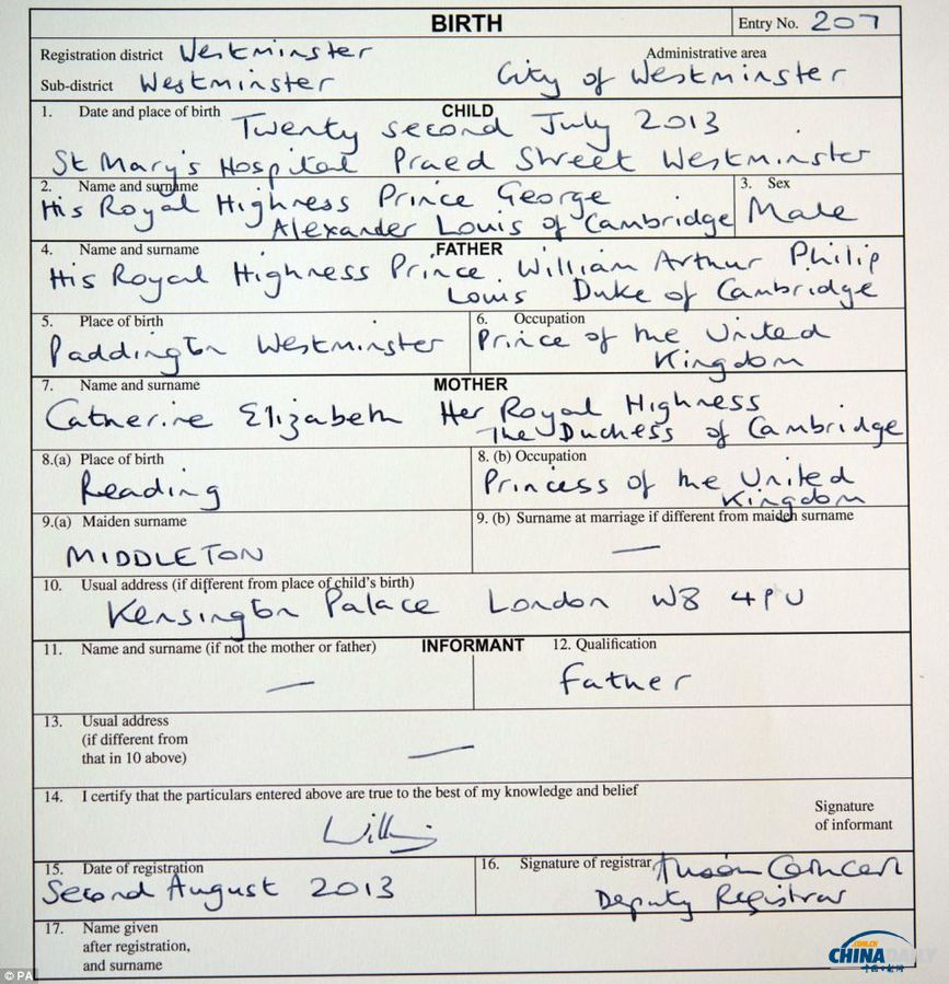 威廉王子在喬治王子的出生證明上簽了字,小王子母親的職業(yè)所填寫的是“英國的王妃”。
