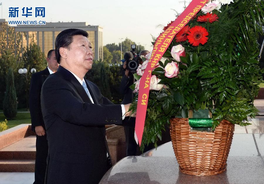9月9日,中國國家主席習近平在烏茲別克斯坦總統(tǒng)卡里莫夫陪同下向烏茲別克斯坦獨立與人道主義紀念碑獻花籃。