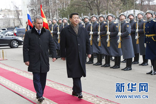 下午,俄羅斯國防部大樓前軍旗招展,禮兵雄立。3時許,習近平抵達現場,俄羅斯國防部長紹伊古在大樓前熱情迎接,并為習近平舉行了隆重歡迎儀式。在雄壯的軍樂聲中,習近平檢閱俄羅斯三軍儀仗隊。俄羅斯三軍儀仗隊整齊列隊,向習近平行注目禮。軍樂隊演奏中俄兩國國歌。