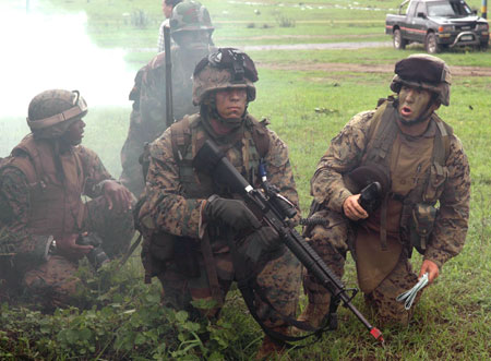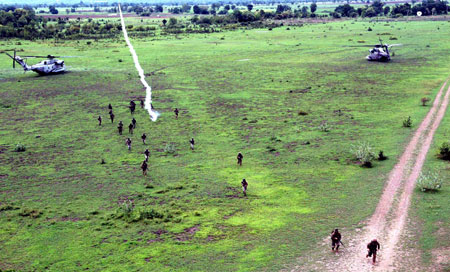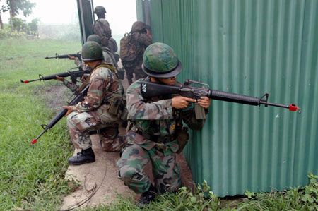2006年5月22日,在泰國(guó)中部的華富里府,泰國(guó)和美國(guó)軍隊(duì)舉行了兩國(guó)特種部隊(duì)首次聯(lián)合反恐演習(xí)。本次演習(xí)是2006年度“金色眼鏡蛇”多國(guó)聯(lián)合軍演的一部分。(來源:新華社)
