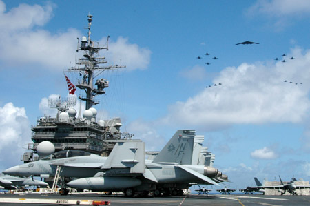 在以美空軍B-2轟炸機為首的機隊后面,美軍“小鷹”、“里根”和“林肯”號三個航母戰(zhàn)斗群呈縱列齊頭并進