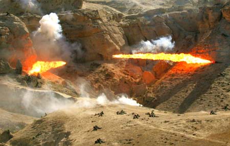 突擊隊(duì)員使用噴火器消滅藏匿在洞穴里的頑固分子