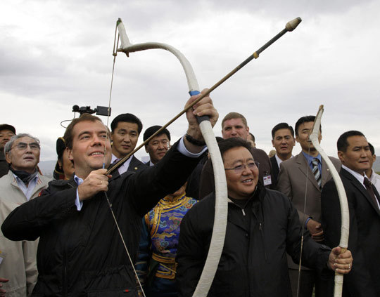 8月26日,俄羅斯總統(tǒng)梅德韋杰夫在蒙古訪問期間,饒有興致的參加了在烏蘭巴托舉行的那達(dá)慕大會,并且親自彎弓搭箭,一試身手。