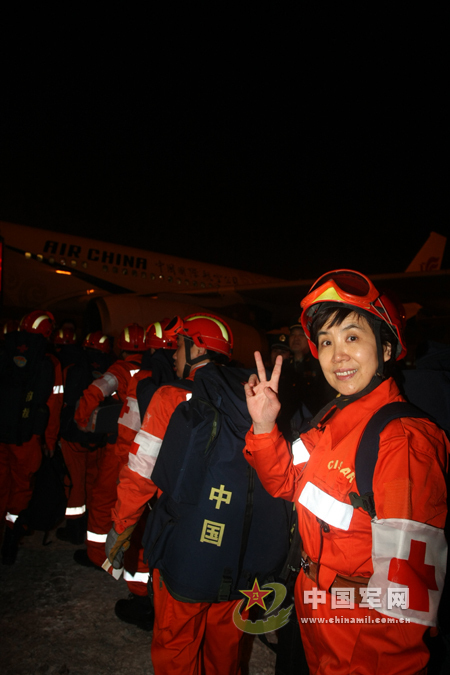 踏上飛機時,中國國際救援隊醫(yī)療分隊中年齡最大的女隊員曹力做出勝利的手勢