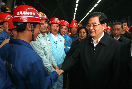 這是胡錦濤來(lái)到廈門(mén)翔安隧道建設(shè)工地,親切看望慰問(wèn)節(jié)日期間仍?shī)^戰(zhàn)在工地上的農(nóng)民工。新華社記者鞠鵬攝