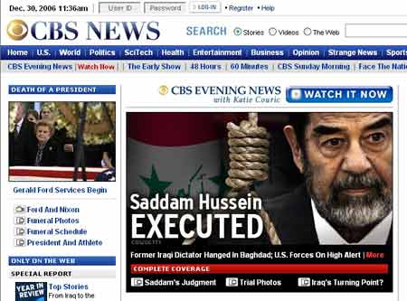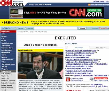 中國(guó)日?qǐng)?bào)網(wǎng)環(huán)球在線消息:北京時(shí)間12月30日11時(shí),薩達(dá)姆被處以絞刑。以下是世界主要媒體當(dāng)日對(duì)薩達(dá)姆被處以絞刑的報(bào)道。