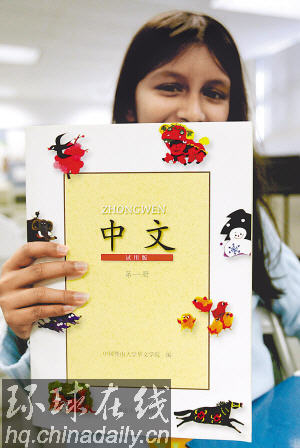漢語(yǔ)熱在世界持續(xù)升溫。圖為美國(guó)弗吉尼亞州一名學(xué)生展示她的中文課本。