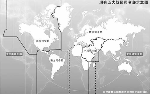 現(xiàn)有五大戰(zhàn)區(qū)司令部示意圖。圖中虛線區(qū)域將成為非洲司令部的轄區(qū)。