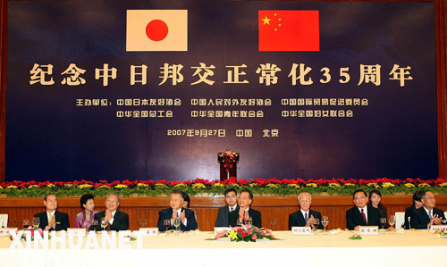 9月27日,國(guó)務(wù)院總理溫家寶與日本客人在北京人民大會(huì)堂共同出席紀(jì)念中日邦交正常化35周年招待會(huì)。 新華社記者高潔攝